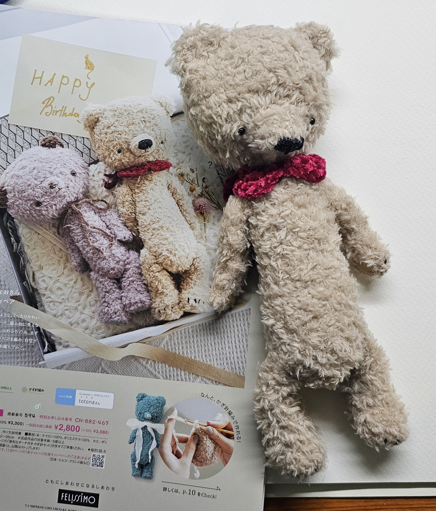 つくる フェリシモこう見えてかぎ針編みくったり愛着テディベアの、2 マシューできましたよ!わたしの相棒誕生ですね!まあだいたい合ってるっしょなんか見本よりちょっと細長い気はするけどスリムスリム 2024/10/15 Tue (1年以上前) No.1364 編集 削除