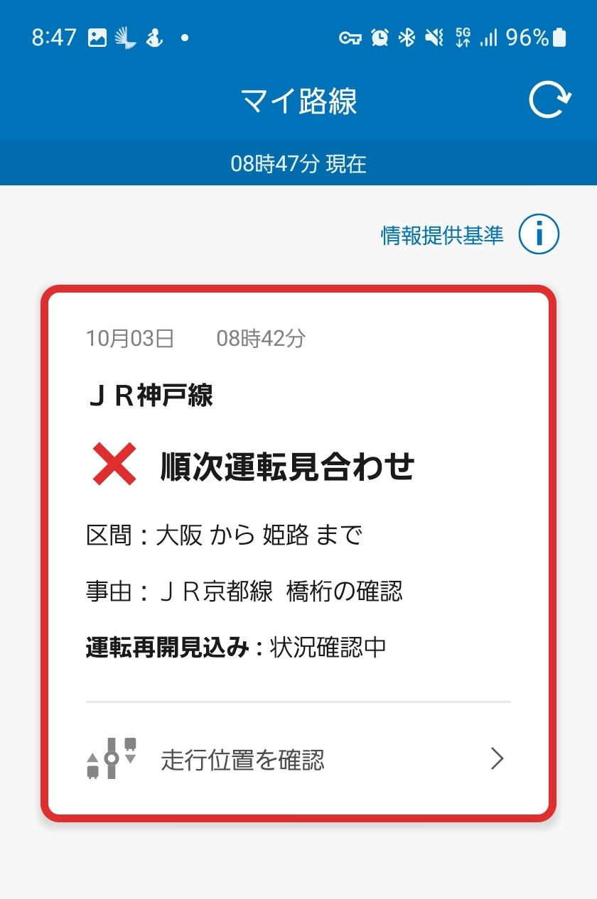 さあーーーどうなる!?(現在普通列車乗車中)追記判断がはやいので振替輸送開始待たずに三宮で阪神電車に乗り換えました多分間に合うわ200円<混雑のなさ振替輸送待ちで有人改札に列できてたからね…(振替輸送開始まであと5分くらいあった)追記電車遅延のわりに職場のLINEグループ静かだなあと思ったら、昨日メイングループも通知オフにしたんだったわ。ホーム画面上にショートカット作っといたら通知バッジつくかと思ってたけど、つかないんだな… 2023/10/03 Tue (2年以上前) No.685 編集 削除