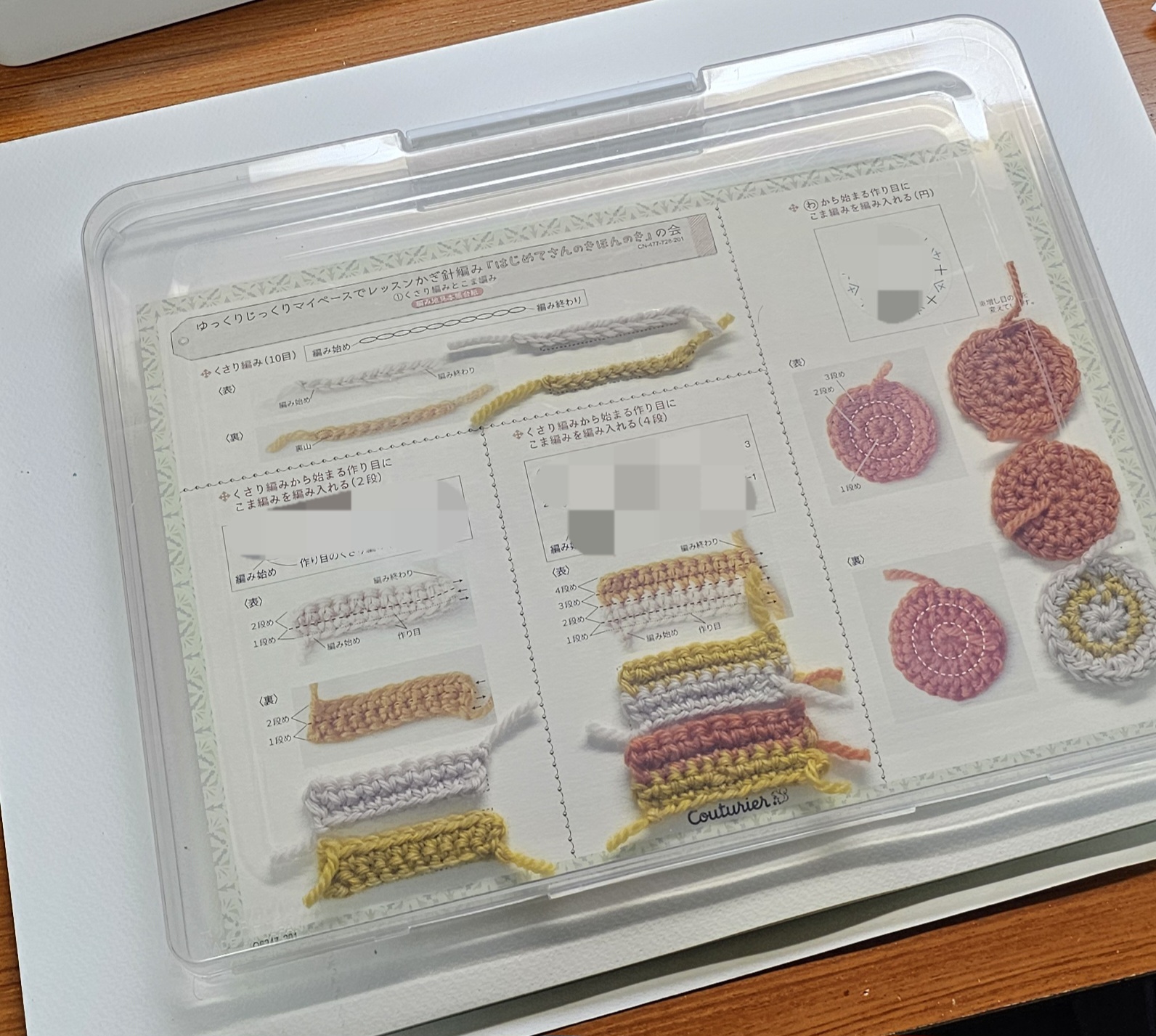つくる フェリシモ「ゆっくりじっくりマイペースでレッスンかぎ針編み はじめてさんのきほんのき の会」の1回目厚紙の台紙に編んだものを直接貼り付けて、見本にするのか…なんか保管が邪魔そうなんだよなー、と乗り気ではなかったんですがかわいい!デザインがいいのか色味がいいのか毛糸貼ることでかわいさ増してませんか!保管に関しては、まあプラケースに入れておけばいいか… 2025/04/13 Sun (275日前) No.1612 編集 削除